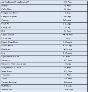 10. Below is an amp chart with some typical amperage draws for appliances and accessories commonly found in RVs. This is just a basic guide to assist you in how many amps you are using at any given time, so you don’t exceed the RV’s electrical system rating.