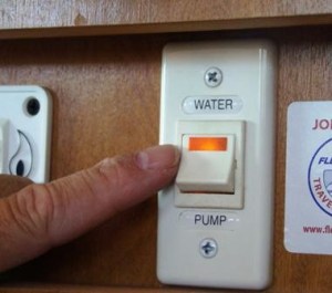 8. Water from the RV fresh water holding tank is supplied throughout the RV by a 12-volt DC demand type water pump. The pump requires a 12-volt deep cycle battery, if you don’t have access to an external electrical source. You simply turn the switch on, usually located by the monitor panel, and the pump pressurizes the system and you have water.