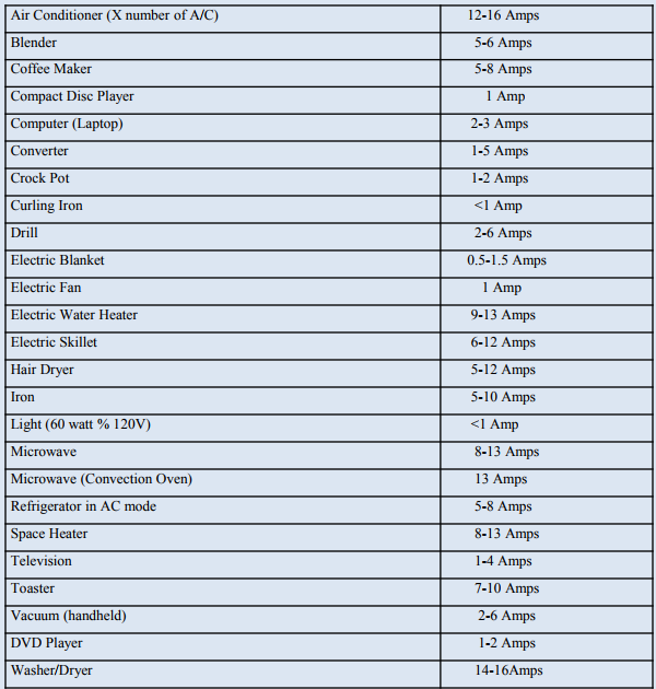 10. Below is an amp chart with some typical amperage draws for appliances and accessories commonly found in RVs. This is just a basic guide to assist you in how many amps you are using at any given time, so you don’t exceed the RV’s electrical system rating.